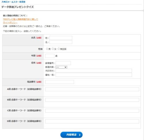 上記でふれました、番組中のデータ放送上のキーワード=応募電話番号に発信番号通知にして電話をかけることで応募完了です。