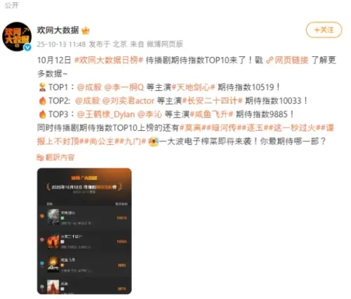 また、今後公開予定のドラマ、「天地剑心」と「长安二十四计」は2025年10月13日現在中国で最も期待するドラマのTOP1&2を独占(👇)。ますます注目が集まっています。