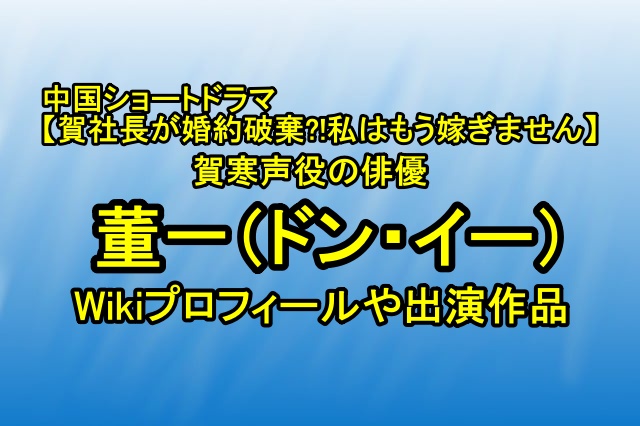 そこで、本記事では俳優・董一(ドン・イー)さんのWikiプロフィールや経歴、上記【賀社長が婚約破棄?!私はもう嫁ぎません】を含めた代表的な出演作品と共演者情報などをまとめてお届けします。