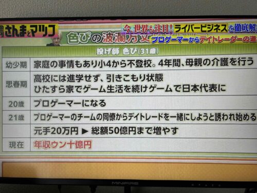 - →4/20と4/27放送から色ぴさんの生い立ちがわかりました。幼少から母親の介護、不登校となり、ゲームをするしかなかった人生からプロへ転向。その時にデイトレードをはじめたことも人生の転機だとわかりました。