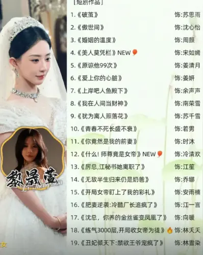 - 2025年上半期:『美人莫凭栏』や『什么!師尊竟是女帝』など、ファンタジー系や時代劇を含む幅広いジャンルのショートドラマに出演しました。