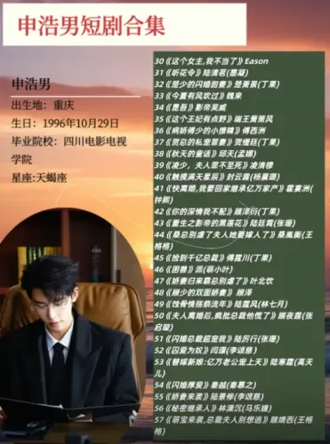 特に2023年以降は「ショートドラマ界のプリンス」と呼ばれるほど出演作が多く、恋愛・時代劇・ファンタジーなど多彩なジャンルで主演を務めています。