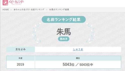 ただ、漢字で朱馬、読み方が「しゅま」という完全一致はヒットしませんでしたので、石原朱馬(しゅま)ちゃんの名前はかなりレアなのだとわかりました。