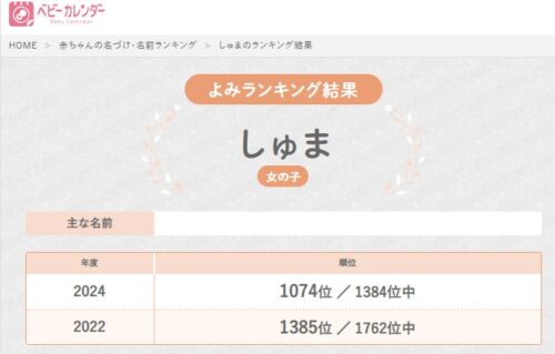 ちなみに女の子の名前でも「しゅうま」で調べてみましたが、データなしでした。