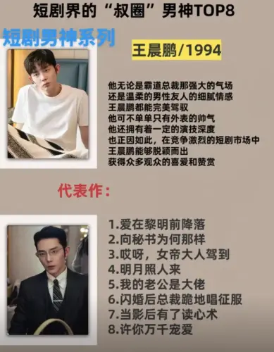 王晨鹏さんは、短編ドラマを中心に多くの映像作品に出演し、安定したキャリアを築いている中国内地俳優です。彼の経歴と俳優としての特徴は、以下の通りです。